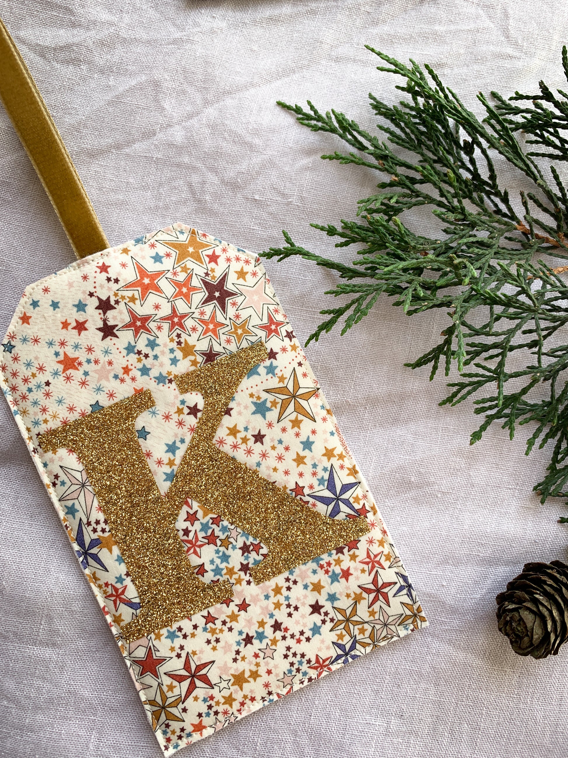 This personalised Initial Tag is the perfect size for the Liberty Print Christmas Sack. With a choice of prints available and finished with a gold velvet hanging loop and choice of either ivory felt or silver/gold glitter initial.