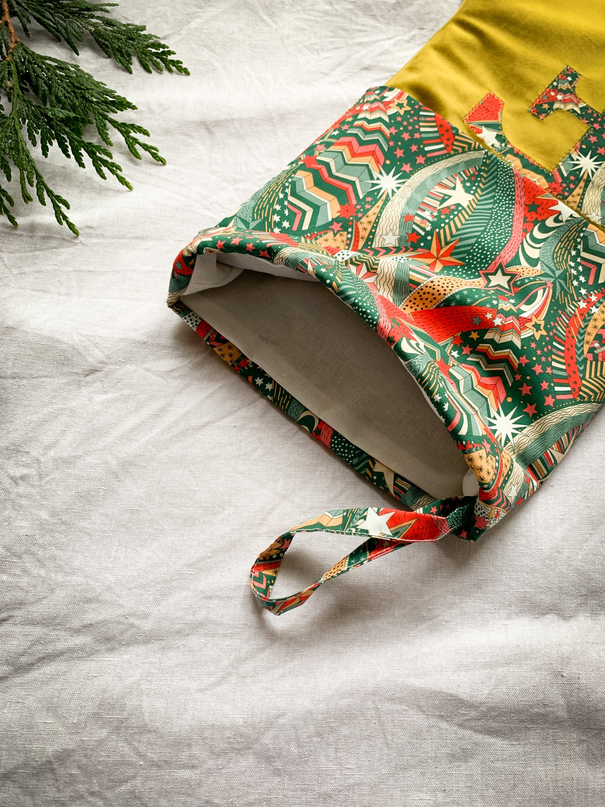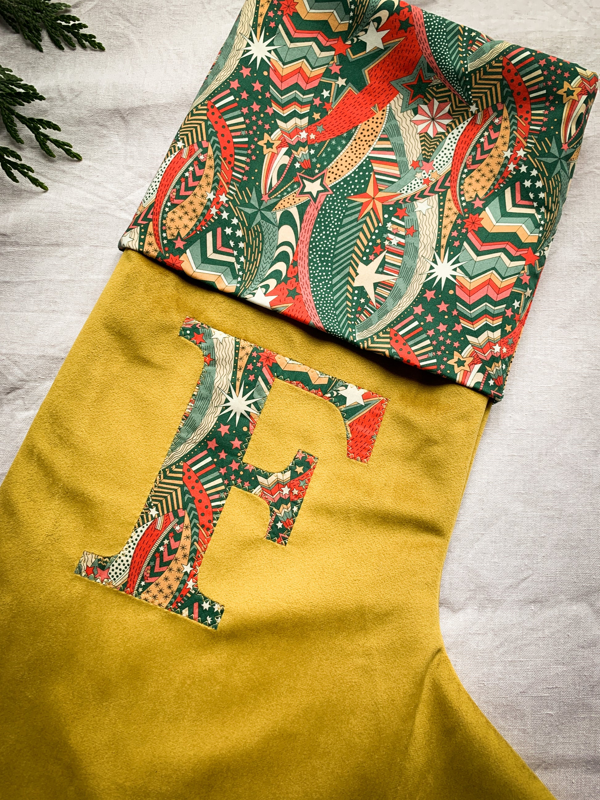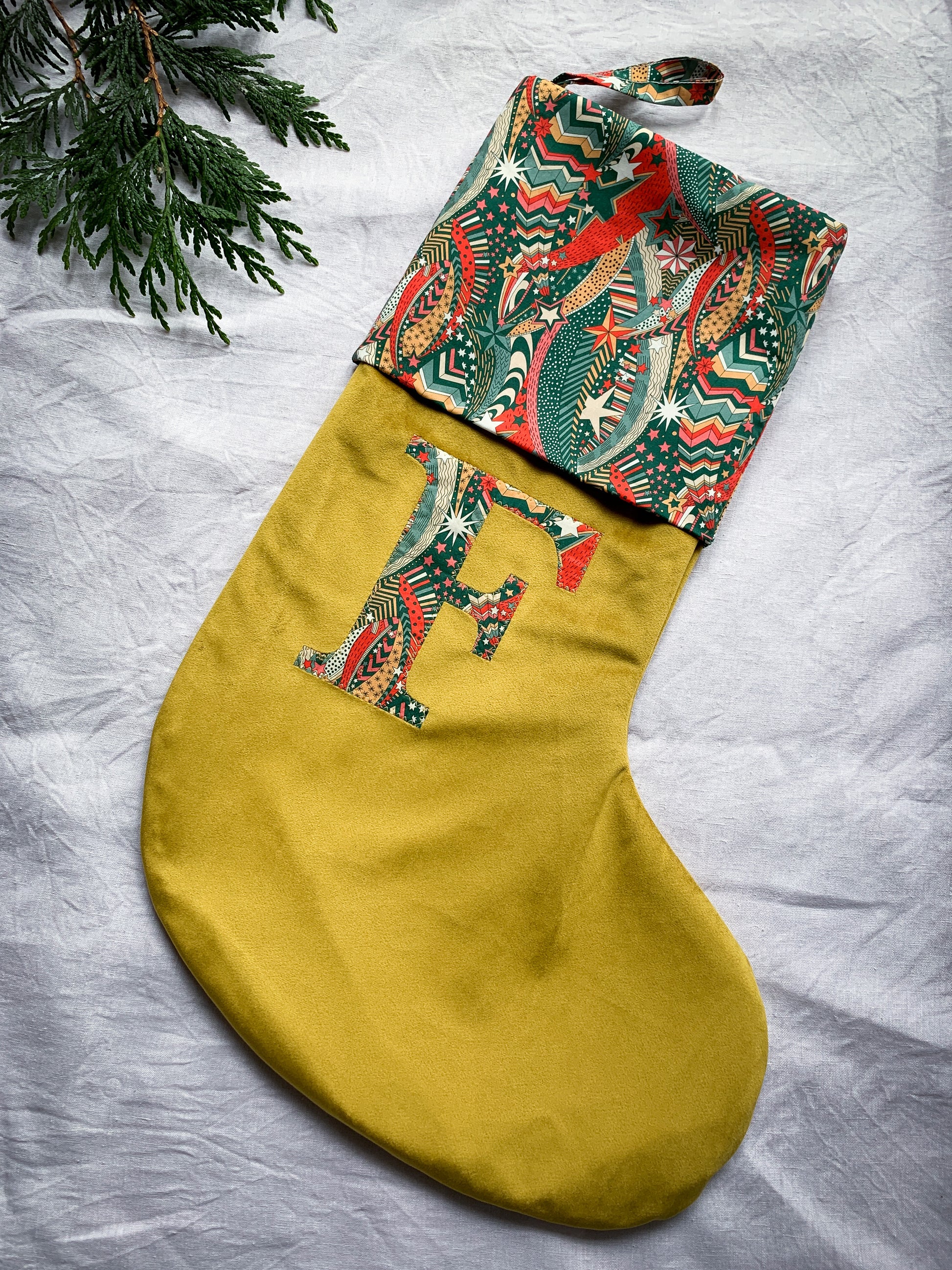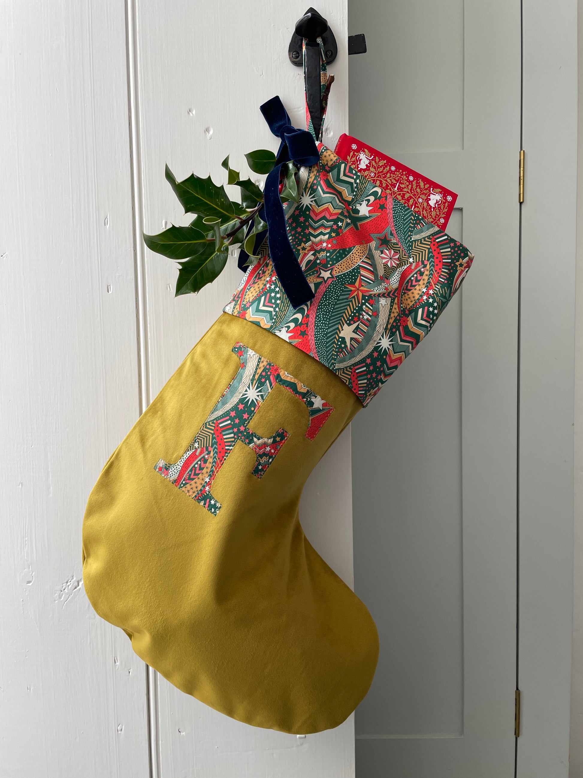Made from buttery soft Gold velvet with the print of your choice. The stocking has a large Liberty Print Initial and beautiful printed cuff with hanging loop, lined with beautiful linen in either ivory or navy depending on the print selected.