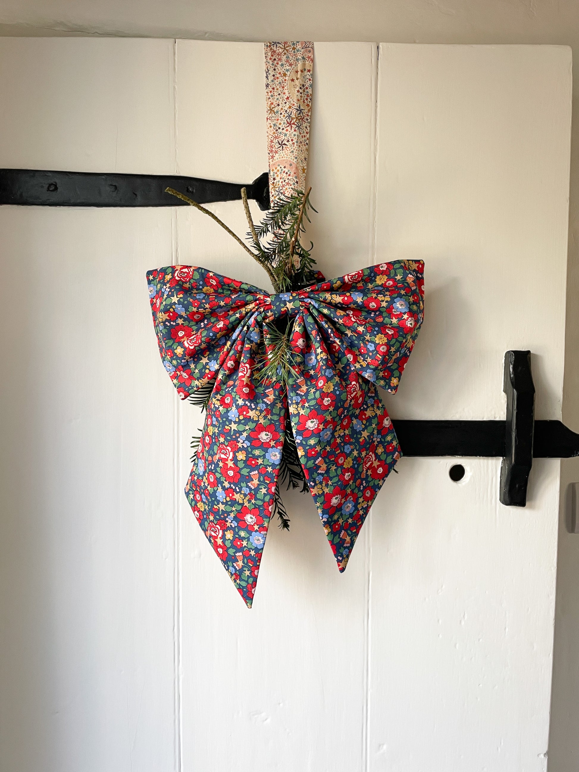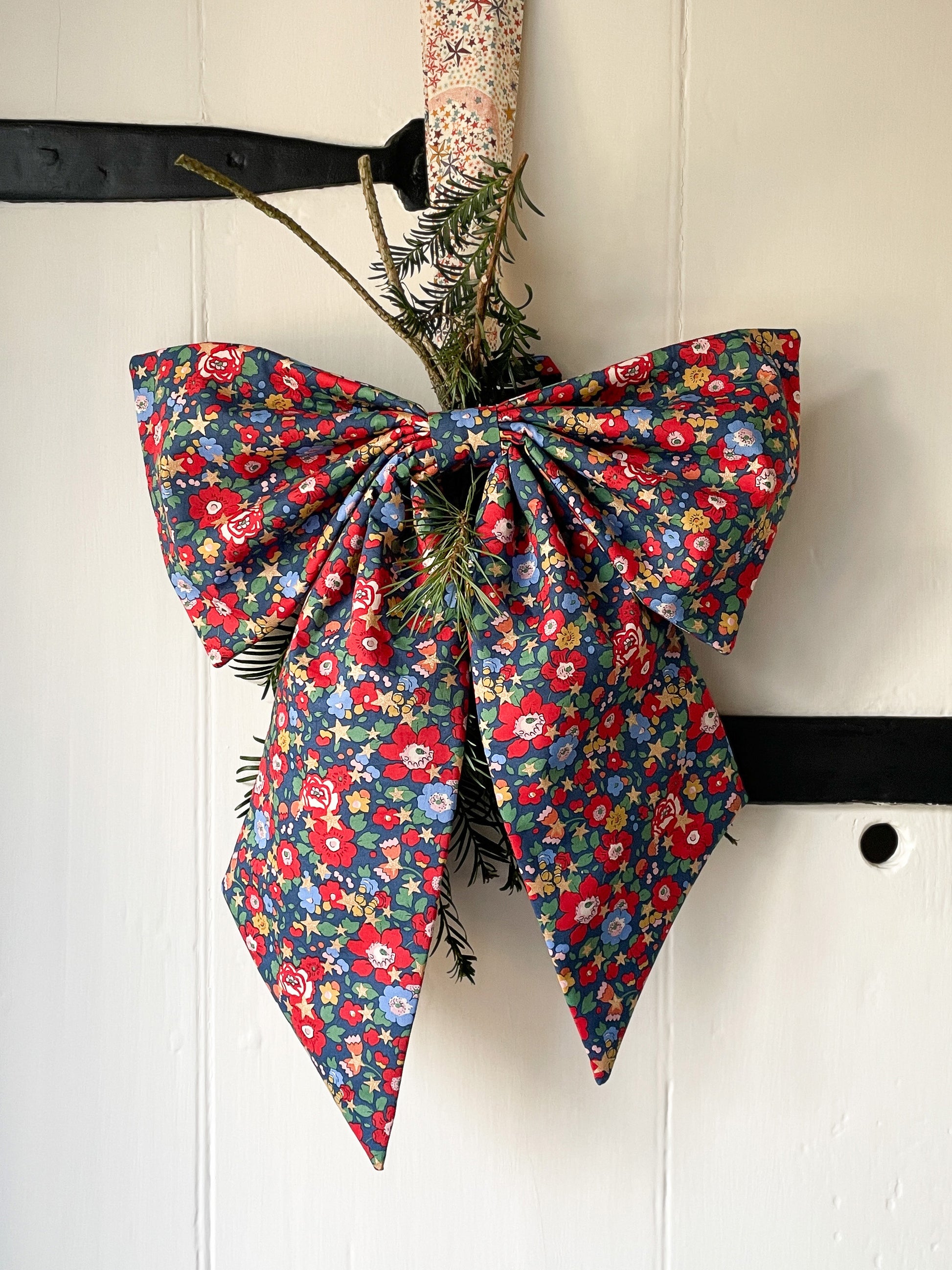With a cotton wadding fill and a some added structure to the fabric it stands proudly and can be tweaked and shaped how you like. With a self fabric tie to the back this could adorn the top of your tree, a fireplace, a doorway, a wreath. So many options.