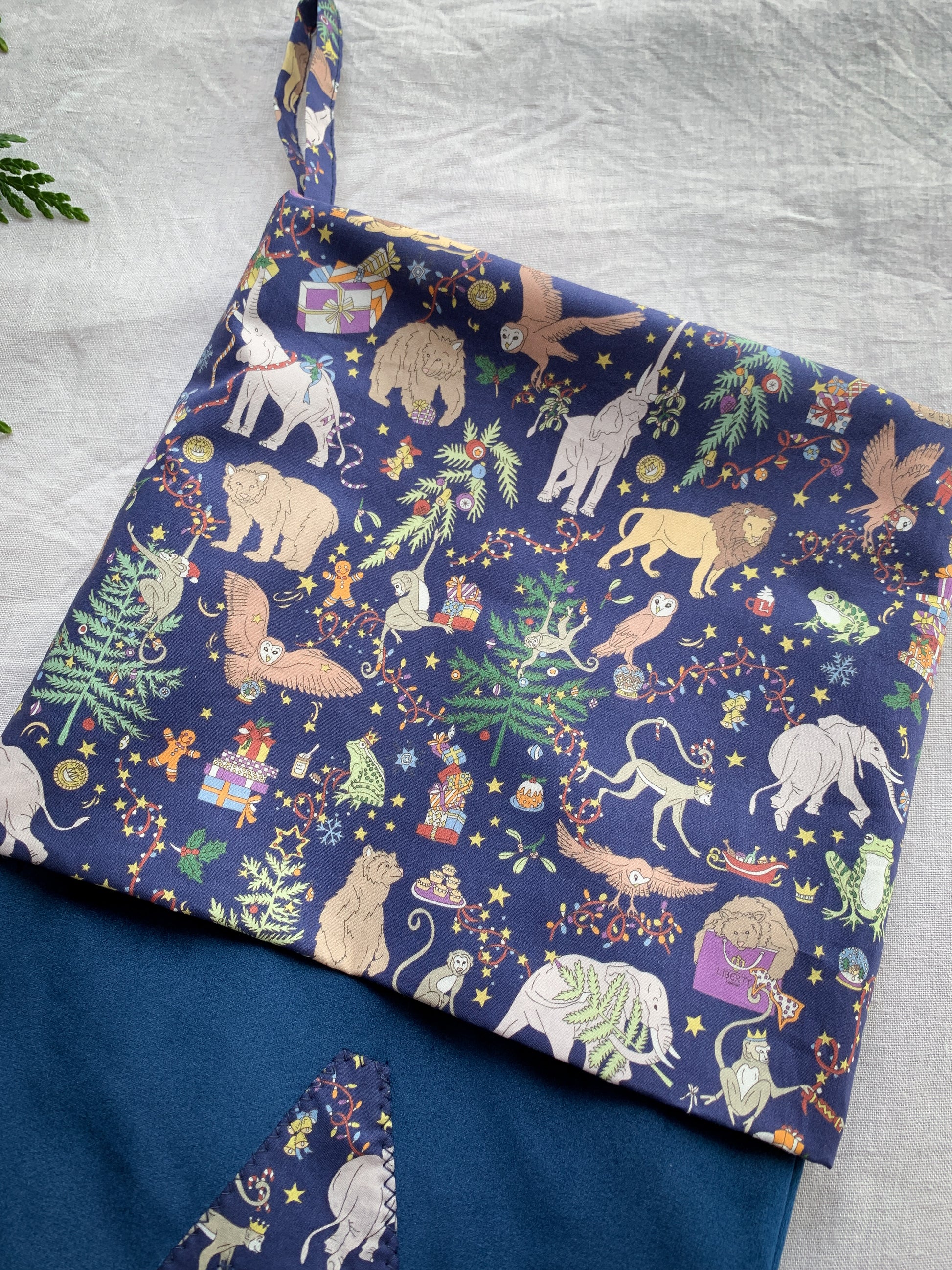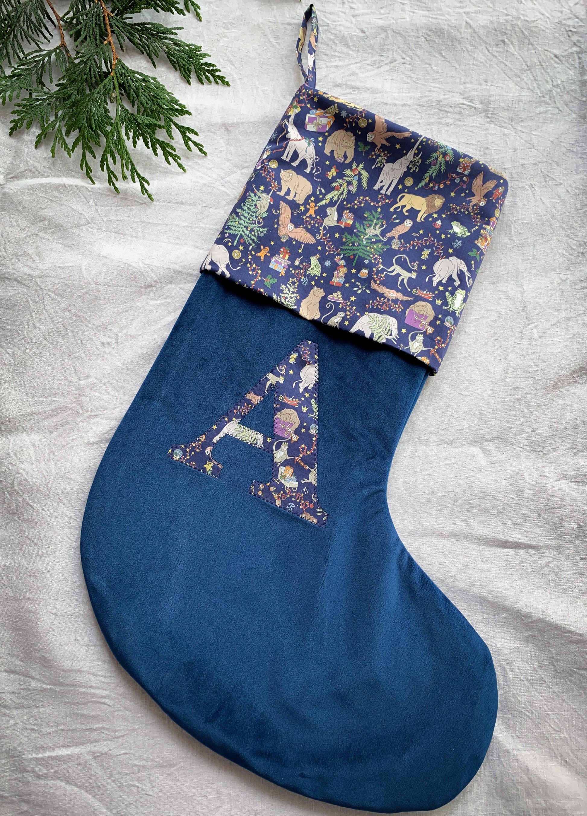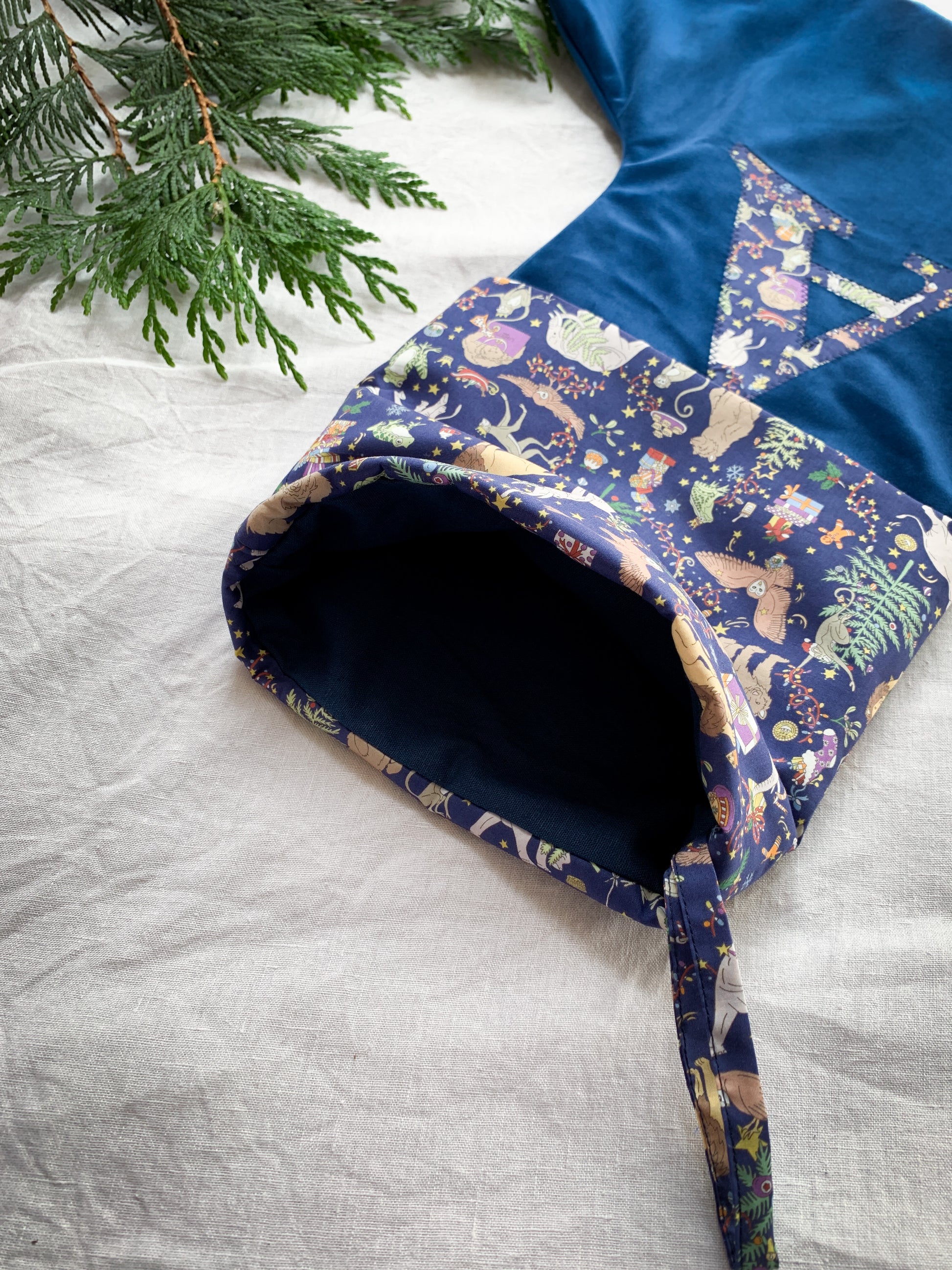 Made from buttery soft Navy velvet with the print of your choice. The stocking has a large Liberty Print Initial and beautiful printed cuff with hanging loop, lined with beautiful linen in either ivory or navy depending on the print selected.